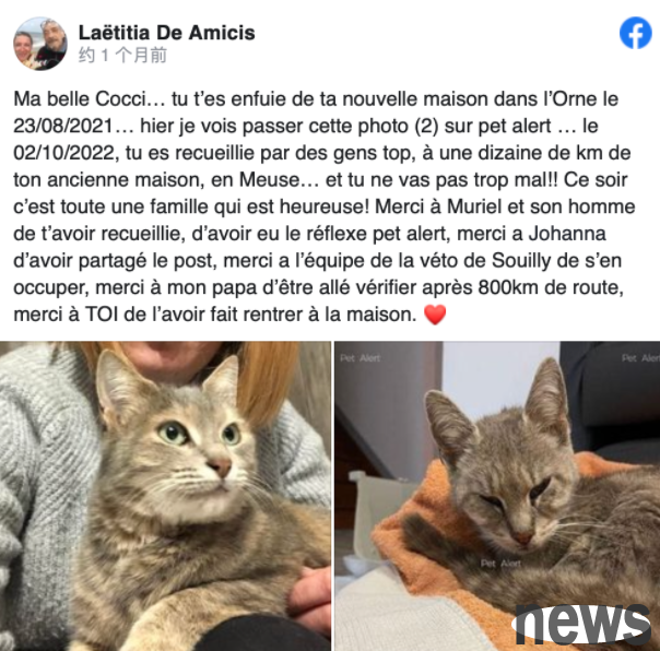 As early as August last year, Cocci’s owner, Lætitia’s family, moved from La Meuse (La Meuse), France, to Orne (L'Orne). After the move, I don’t know whether the kitten couldn’t adapt to the new environment or for some other reason. Not long after, Cocci disappeared from home.