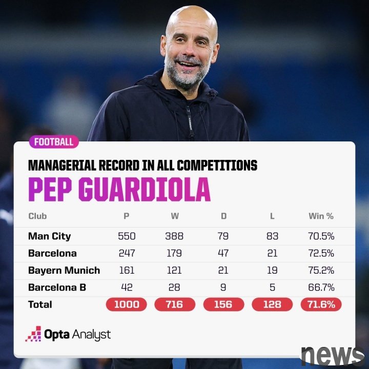 In 1,000 games during his coaching career, Guardiola has achieved a record of 716 wins, 156 draws and 128 losses, with a winning rate of over 70%.