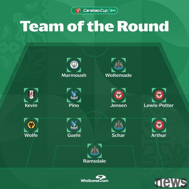 The fourth round of the English League Cup has ended. Today, the best lineup for the round was officially announced. Newcastle and Brentford each have three players selected, including Malmouche, Walter Mader, and Gueye.