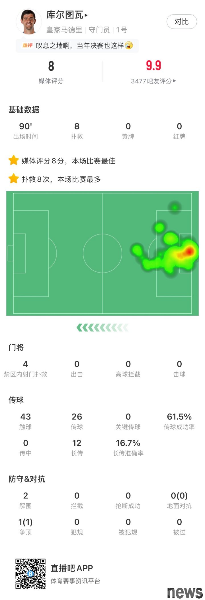 Indispensable! Courtois made 8 saves in the game, and Real Madrid only conceded 1 goal after many saves.