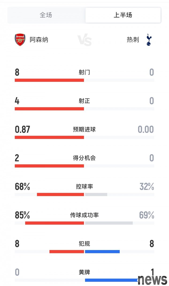 One-sided! Arsenal vs Tottenham half-time statistics: Gunners 70% possession rate, shot 8-0