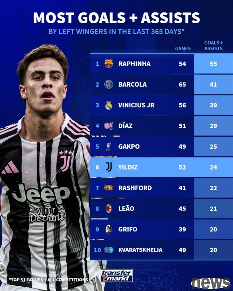The German transfer market has counted the number of goals scored by left wingers in the past year in the five major leagues. Rafinia ranked first in 55 goals, and Yilditz ranked 6th in 24 goals. It is worth mentioning that Yilditz's German turnover price will be updated tomorrow.