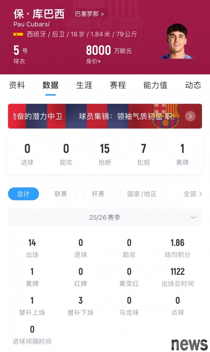 Cubasi is 18 years old and serves as a central defender. He has played 14 times for Barcelona this season and is currently worth up to 80 million. He is one of the most valuable players at the defender position in the world.
