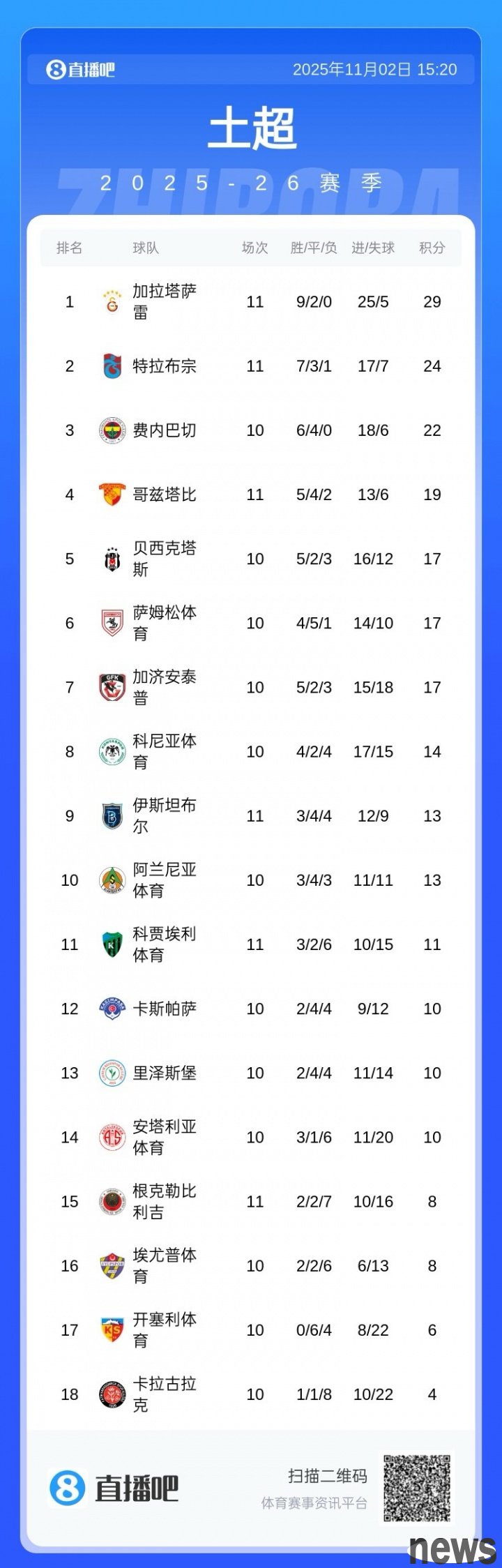 Latest standings of Turkish Super League↓