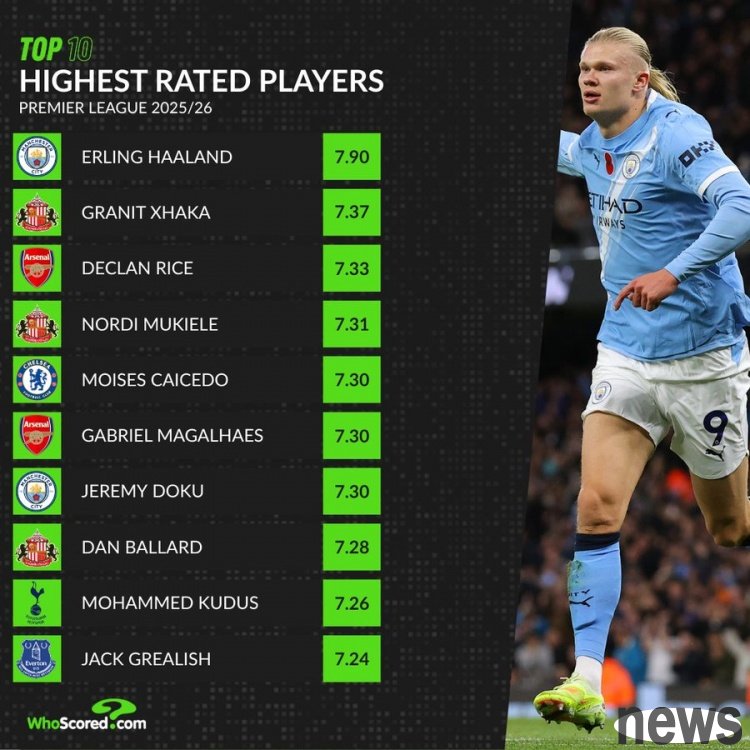 So far, there have been 11 rounds of the Premier League this season. WhoScored lists the player ratings, with Haaland ranking first with 7.90 and Xhaka second with 7.37.